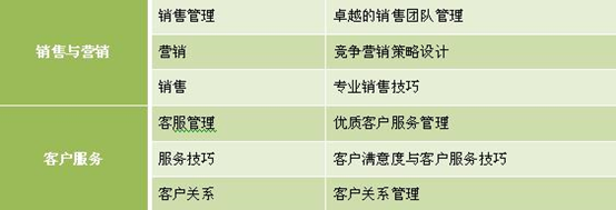 公司各個(gè)組織單元下的職能可以進(jìn)行進(jìn)一步的細(xì)分,根據(jù)細(xì)分的職能就可以確定專業(yè)方向上的培訓(xùn)課程體系。人力資源單元可以分為人力資源管理、招聘、員工發(fā)展、績效、薪酬、員工關(guān)系;行政單元可以分為行政管理、秘書;財(cái)務(wù)單元可以分為財(cái)務(wù)管理、會(huì)計(jì)、審計(jì);物流與供應(yīng)單元可以分為采購、物流、倉儲(chǔ);生產(chǎn)與質(zhì)量管理單元可以分為生產(chǎn)管理、現(xiàn)場管理、流程管理、質(zhì)量管理、過程管理;銷售與營銷單元可以分為銷售團(tuán)隊(duì)管理、營銷、銷售、市場;客戶服務(wù)單元可以分為客服管理系統(tǒng)、客戶服務(wù)、客戶關(guān)系。以下為專業(yè)類課程體系部分部分內(nèi)容:
