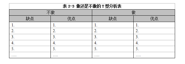此時,如果你習(xí)慣性地拿出一支筆、一張白紙,隨手畫一個T型分析表(見表2-2),也許就能幫你快速理清思路,做出你真正想要的那個正確的選擇。