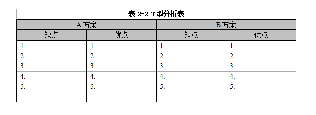 面對任何需要決策的難題時,請習(xí)慣性地拿出一張白紙,順手畫一個T型分析表,做一次T型分析。